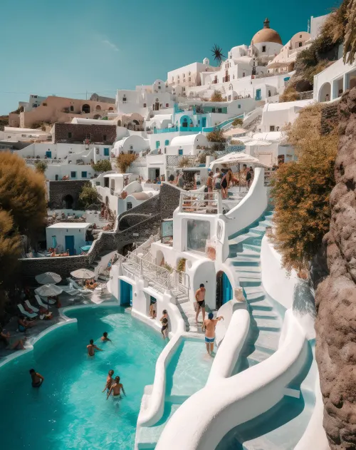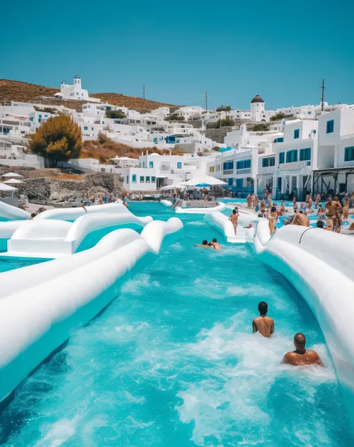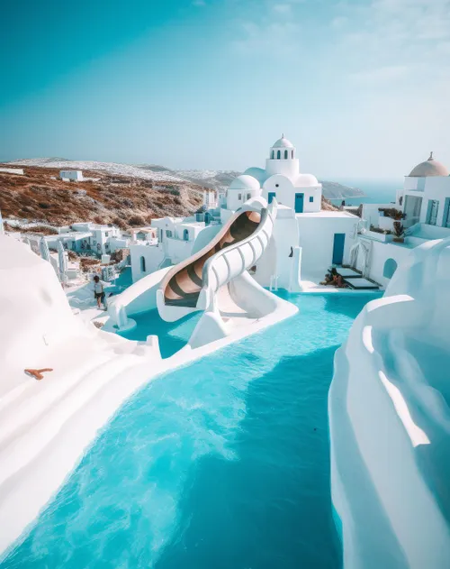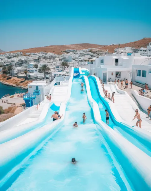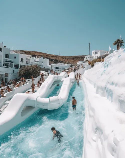 Maar niets aan de foto is echt en er bestaat natuurlijk niet echt een wildwaterbaan die dwars door de stad loopt. De Griekse overheid weet in ieder geval wel wat ze moeten bouwen als het stilvalt met het toerisme. Een origineel ontwerp maken blijkt ook niet meer zo lastig, want we hebben het zelf ook even geprobeerd. De Griekse architecten kunnen dan ook wel inpakken, want kunstmatige intelligentie heeft meer dan genoeg inspiratie.